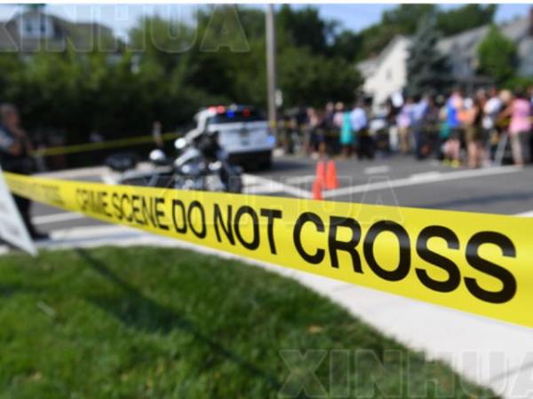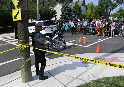 6月14日,在美国弗吉尼亚州亚历山大县,警察和记者在枪击现场附近。(新华社记者殷博古摄)