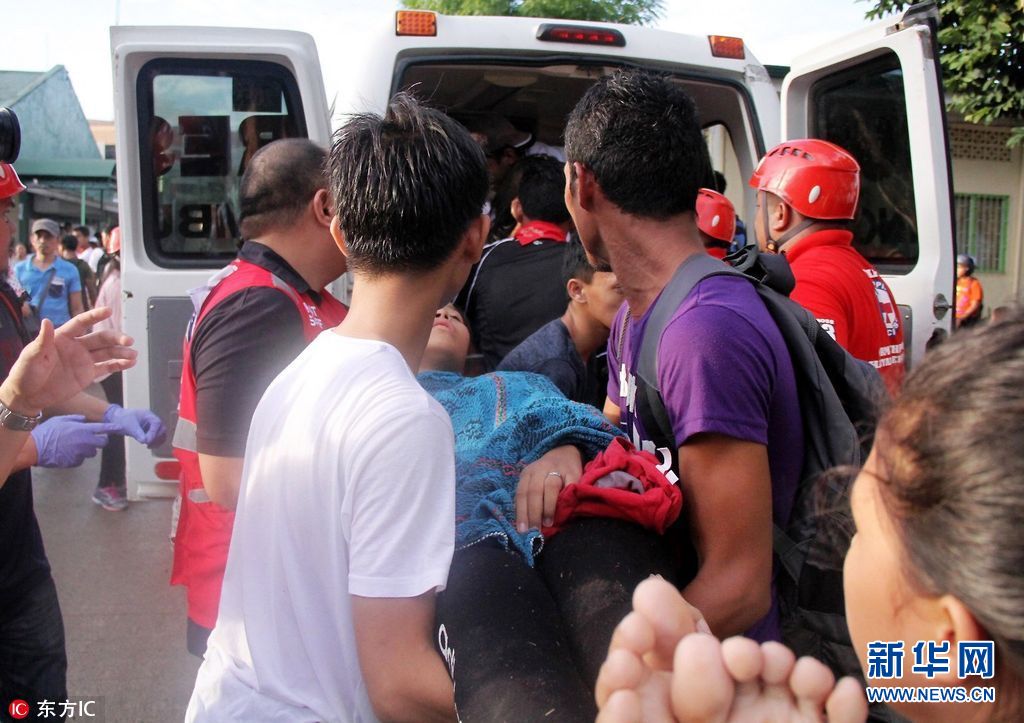当地时间2017年7月6日,菲律宾莱特岛奥莫克市,地震伤员被送上救护车。