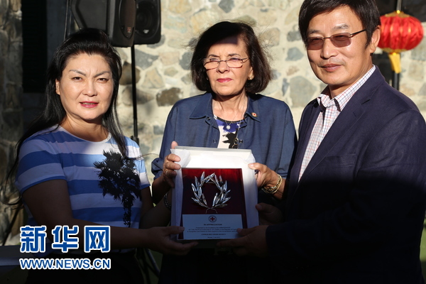 中国驻塞大使黄星原(右)、夫人马丽(左)和塞浦路斯红十字会主席、塞前总统夫人帕帕多普洛(中)合影。新华网记者 张章 摄