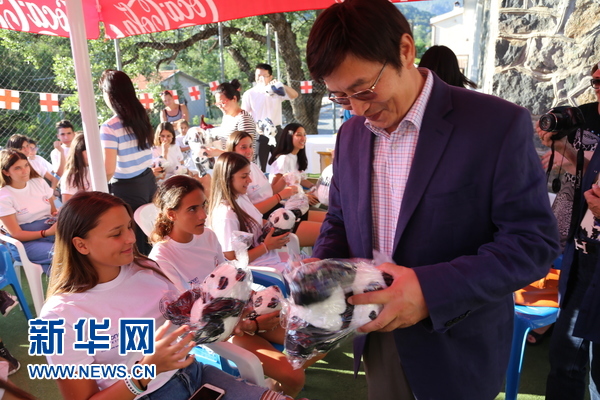 中国驻塞浦路斯大使黄星原向贫困学生发放礼品——中国大熊猫。新华网记者 张章 摄