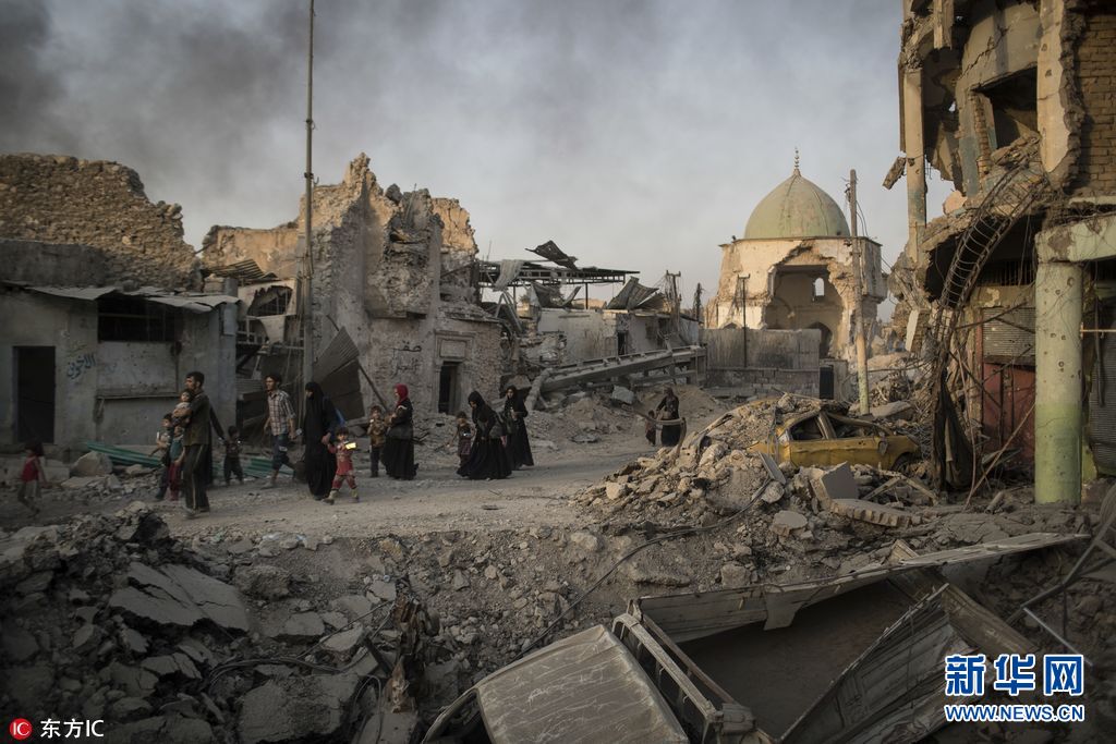 伊拉克摩苏尔,曾被恐怖组织“伊斯兰国”占领的摩苏尔在经过将近9个月的解放战争后,这座历史悠久的老城只剩满目废墟,曾经多达300万的人口成了过往云烟,生命在战争中消逝,成千上万的居民被迫撤离。据联合国人居署卫星图像调查报告,在6月16日至7月18日短短的三周时间内,这座老城近三分之一在轰炸中遭到毁坏,超5000余栋建筑毁于一旦。(图片来源: 东方IC)
