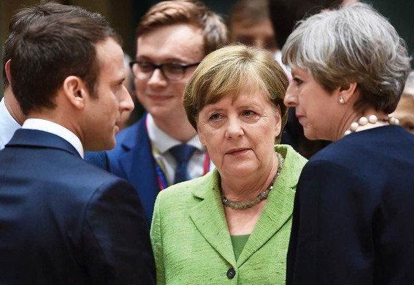 6月22日,欧盟峰会期间,英法德领导人交谈画面。