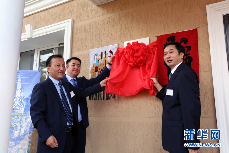张家界市政府副市长欧阳斌,哈萨克斯坦欧亚国立大学旅游学院院长、欧亚-阿斯塔纳旅游有限公司总经理阿达衣·赛肯,阿勒泰环球贸易公司总经理努尔兰·库克买提共同为“中国张家界(阿斯塔纳)丝路驿站”揭牌。