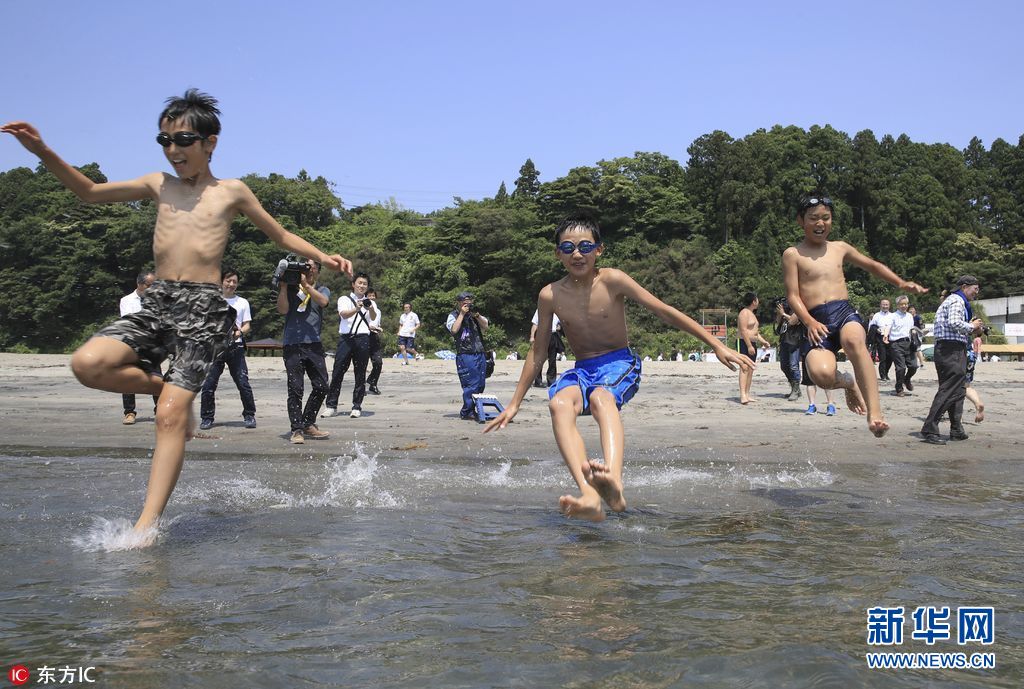 当地时间2017年7月15日,日本宫城县南三陆町,福岛核泄露事故发生6年多后,Sun Ole Sodehama海水浴场首次重新开放,儿童戏水玩耍。(图片来源:东方IC)