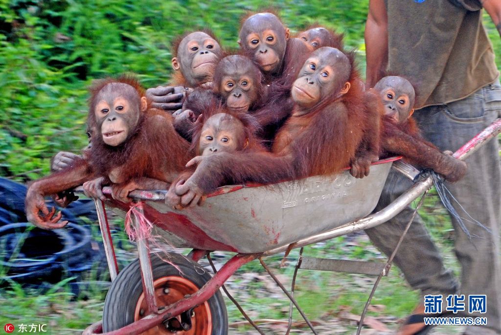 2017年7月20日报道(具体拍摄时间不详),婆罗洲红毛猩猩宝宝搬家啦,它们悠悠然坐在手推车上,一车子毛茸茸的小脑袋小模样简直萌翻了。这些红毛猩猩宝宝在获救后被送往猩猩救援中心,将在这里开始新的生活。(图片来源:东方IC)