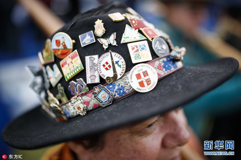 当地时间2017年7月23日,瑞士嫩达兹,瑞士高山举办传统阿尔卑斯号角音乐节。阿尔卑斯号角又被称作山笛,是当地的一种传统管乐器。据悉,超过180名吹号角者现身音乐节,节日将持续3天。(图片来源: 东方IC)