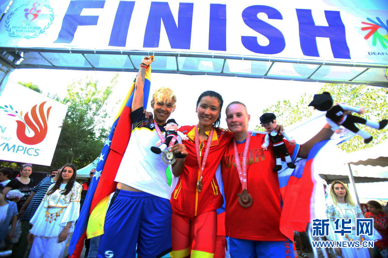 7月23日,在土耳其萨姆松举行的夏季听障奥运会女子自行车个人公路赛中,中国选手徐晓文获得金牌。图为中国选手徐晓文(中)在比赛中庆祝夺冠。新华网发(穆斯塔法·卡亚摄)