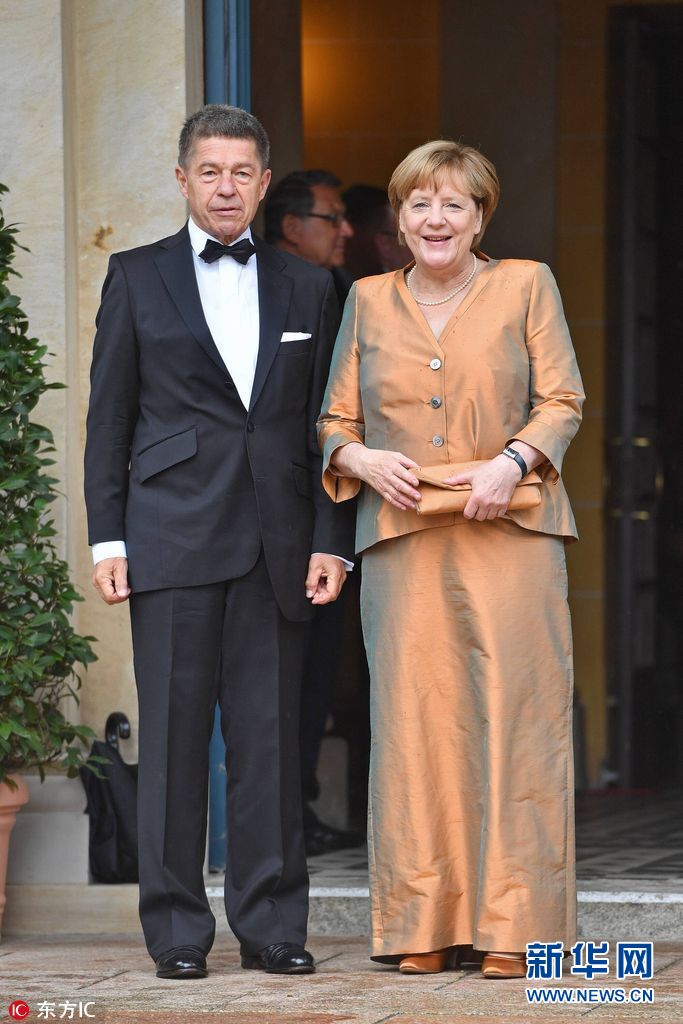 默克尔与丈夫参加音乐节活动 一袭金色礼服优雅亮相(组图)