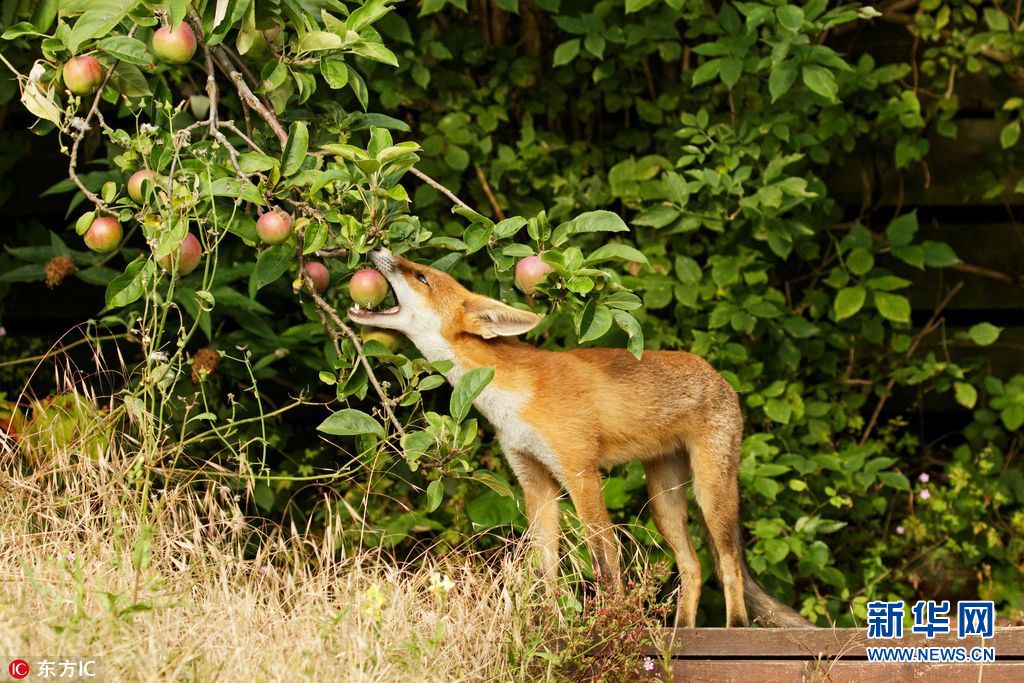 当地时间2017年7月25日,英国东萨塞克斯郡布莱顿,一只雌性小狐狸被郊区一座花园里的苹果吸引,但尝试从树上摘苹果时却失败了。几天后,小狐狸再次回到花园,这时的苹果已经成熟落地了,小狐狸趴在地上吃的不亦乐乎。据说,包括莓子在内的水果,组成了一只年轻狐狸饮食成分的10%。(图片来源: 东方IC)