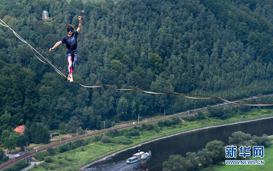 2017年8月5日讯(具体拍摄时间不详),德国柯尼希施泰因,户外运动节期间,冒险者们挑战在易北河之上走高空绳索。图片来源:视觉中国