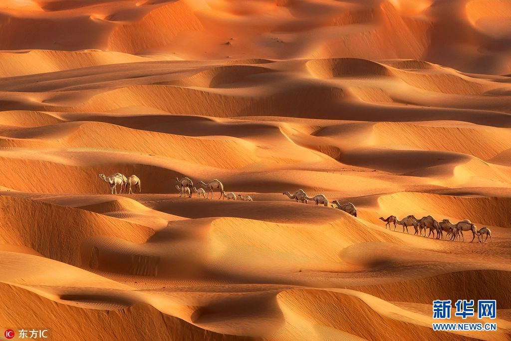 2017年8月7日报道(具体拍摄时间不详),迪拜沙漠,这组震撼的照片展示了一望无际的沙海景象。高地起伏的沙面让这个位于迪拜的沙漠看起来就像是波涛汹涌的海洋一般。一望无际的黄色海洋空空荡荡,唯有几棵点缀的沙漠植物,以及百无聊赖地跋涉着的驼群。来自斯里兰卡的风光旅行摄影师Anushka Eranga Athukorala拍摄下了这些画面。(图片来源:东方IC)