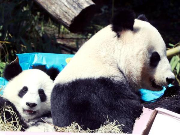 8月7日,在维也纳美泉宫动物园,龙凤胎“福伴”和“福凤”的妈妈“阳阳”在双胞胎周岁生日庆典上打开动物园准备的生日礼物。(新华社记者潘旭摄)