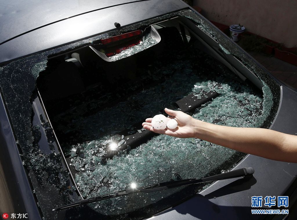 当地时间2017年8月8日,西班牙纳瓦拉省Liedena市,当地遭遇冰雹袭击,颗粒硕大如鸡蛋,车玻璃被冰雹打碎。(图片来源: 东方IC)