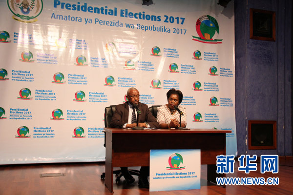8月9日,在卢旺达首都基加利,卢旺达国家选举委员会主席姆班达(左)公布总统选举最终结果。新华社记者 吕天然 摄