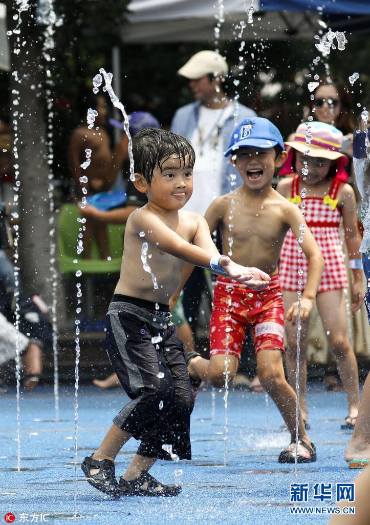 37度高温侵袭日本东京 儿童喷泉玩水降温