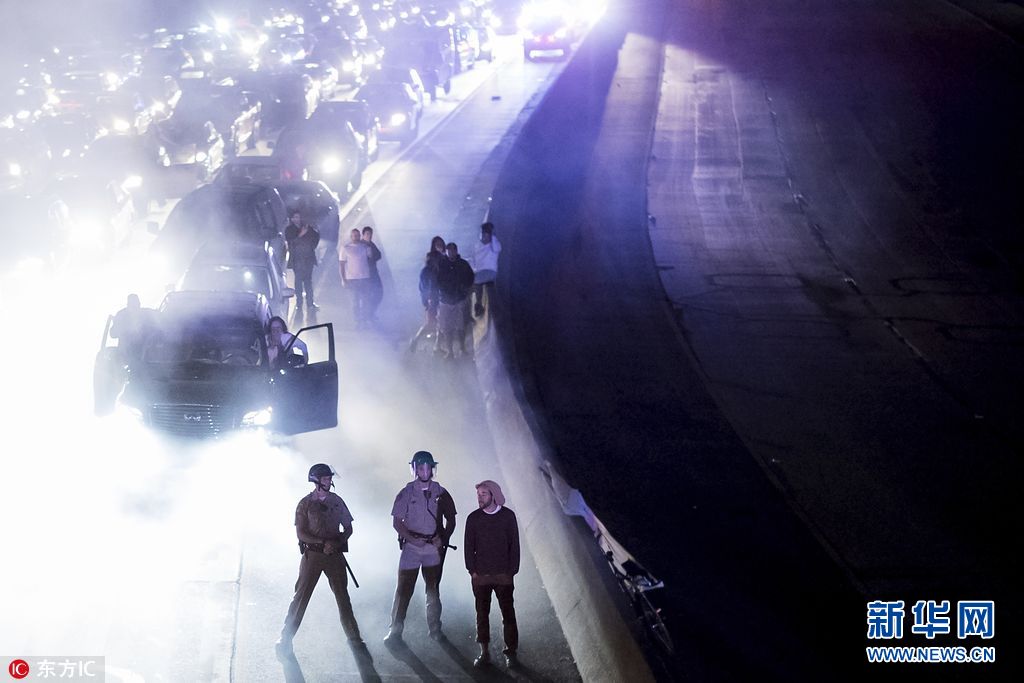 当地时间2017年8月12日,美国加州奥克兰,数百名民众走上街头举行反对种族主义游行,并在加州580号州际公路引发交通阻塞。示威者以此回应弗吉尼亚州爆发的“白人至上主义”暴力冲突活动。(图片来源:东方IC)