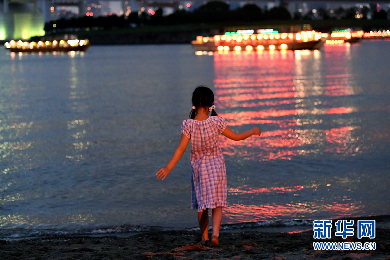 东京台场海滨公园是东京的夏夜纳凉胜地,清凉的海风吹过美丽的彩虹桥,游船上的彩灯将海水照耀得五彩斑斓。13日夜,一个小女孩在海边或弯腰捡拾贝壳,或者凝望着远方的渔火。新华网记者华义 摄