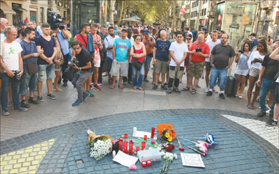 西班牙巴塞罗那恐袭事件后,受害者家属纷纷在兰布拉斯大街举行悼念活动,街上行人自发停下脚步表示哀悼和慰问。记者 王 迪摄