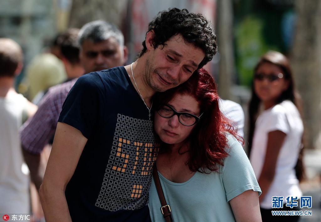 当地时间2017年8月18日,西班牙巴塞罗那,当地民众点烛献花悼念恐袭事件遇难者。17日,一辆白色货车在巴塞罗那市中心兰布拉大道加泰罗尼亚广场附近冲撞人群,据媒体报道,死亡人数已经升至14人。(图片来源:东方IC)