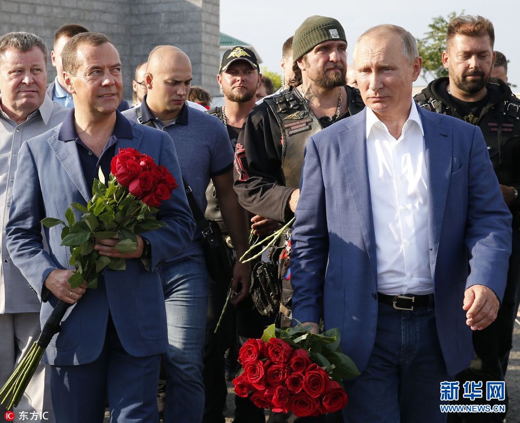 当地时间2017年8月18日,俄罗斯塞瓦斯托波尔,俄罗斯总统普京走访当地,总理梅德韦杰夫作陪。(图片来源: 东方IC)