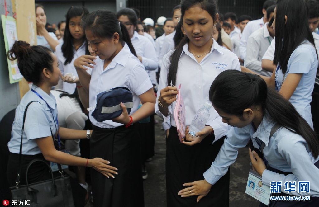 当地时间2017年8月21日,柬埔寨金边,柬埔寨学生参加十二年级考试,工作人员对考生进行检查防止作弊。