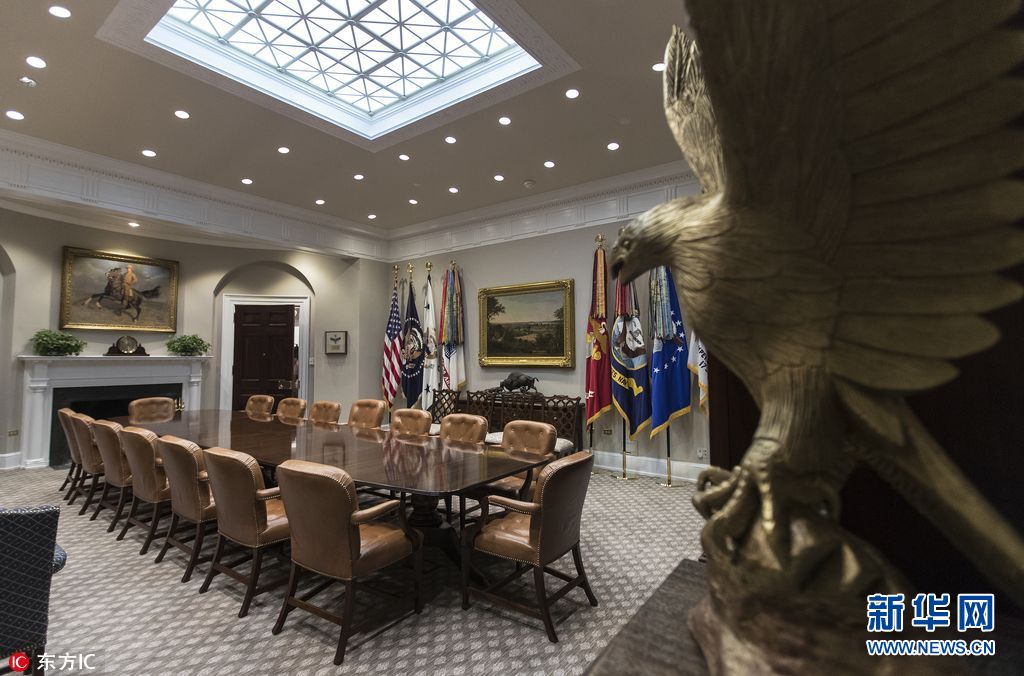 当地时间2017年8月22日,美国华盛顿,白宫装修后的内部照片曝光, 焕然一新富丽堂皇。图为装修后的白宫罗斯福厅。(图片来源:东方IC)