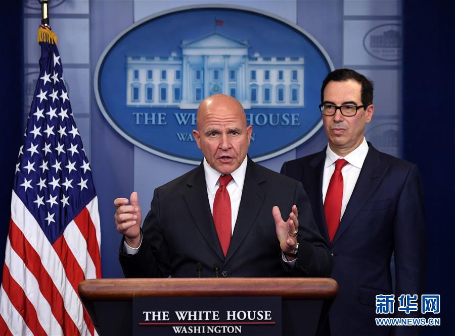 8月25日,在美国华盛顿白宫,美国总统国家安全事务助理麦克马斯特(左)与美国财政部长姆努钦就金融制裁委内瑞拉举行记者会。美国白宫25日宣布,美国总统特朗普已签署行政令,对委内瑞拉实施金融制裁。 新华社记者殷博古摄