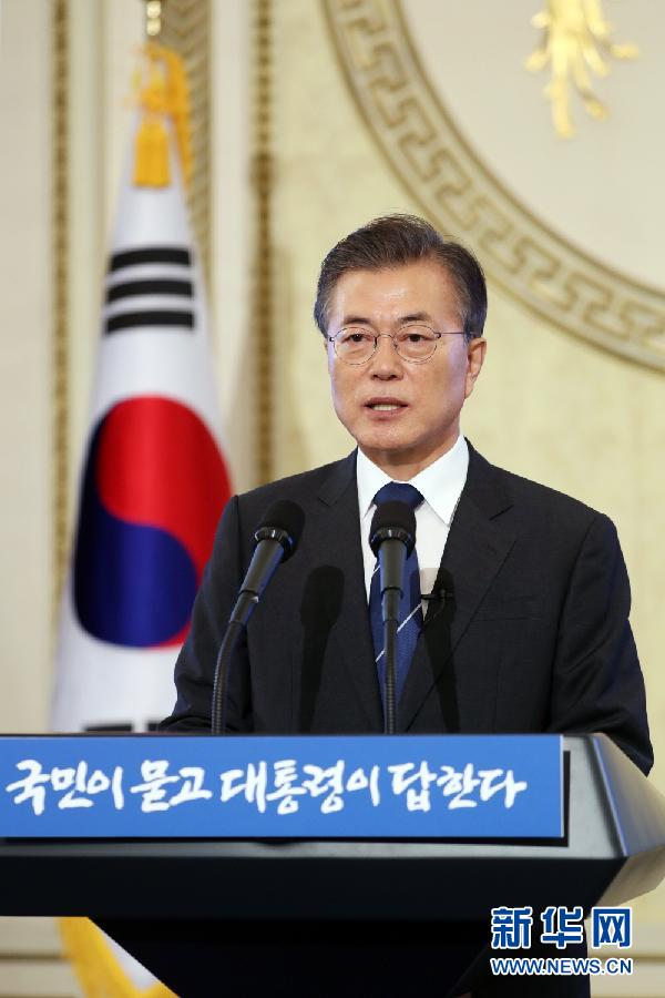 资料图:8月17日,在韩国首尔,韩国总统文在寅在总统府青瓦台举行上任百日记者会。新华网发(姚琪琳摄)