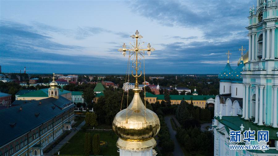 这是8月27日在俄罗斯谢尔盖耶夫镇拍摄的谢尔盖圣三一大修道院内的教堂尖顶。