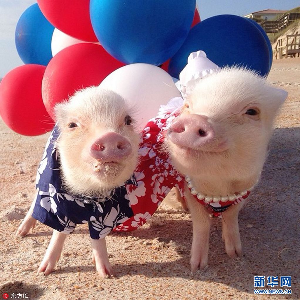 2014年10月报道(具体拍摄时间不详),最近,两只可爱的迷你猪在社交媒体上爆红。它们几乎每天都会以全新的造型亮相,堪称动物界的?#26102;尚教主?#65281;这对可爱的小姐弟叫Priscilla和Poppleton,它们跟42岁的主人Melissa Nicholson住在美国佛州的蓬特韦德拉海滩。Melissa常常帮它们精心打扮,系上蝴蝶结、穿上花边裙、戴上小帽子,然后带着它俩去海边玩耍拍照,上传到Instagram和脸书页面。(图片来源:东方IC)