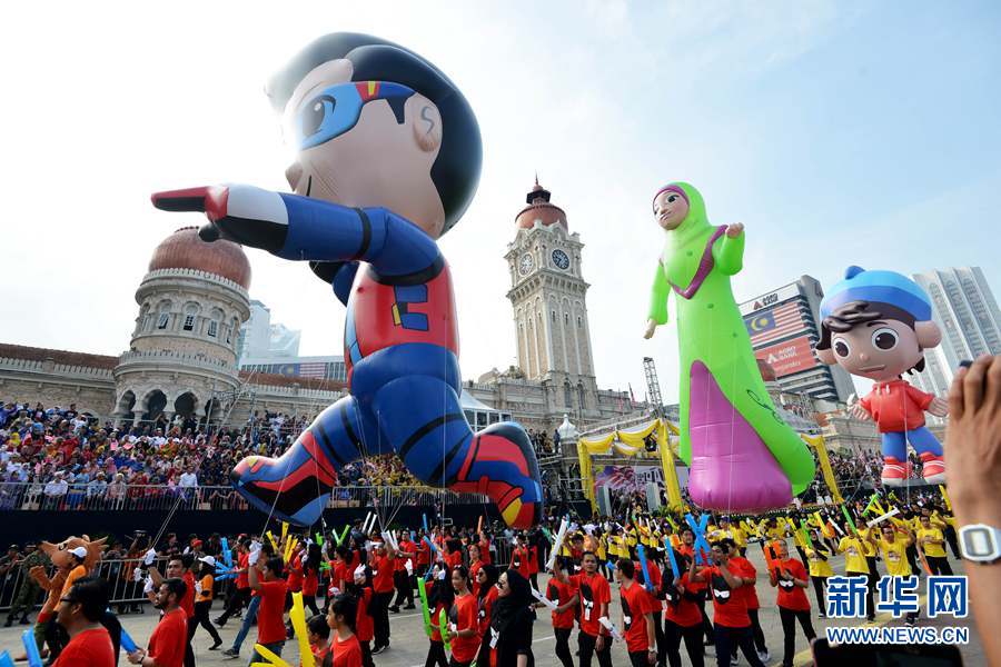 8月31日,在吉隆坡,马来西亚巨型卡通人物在吉隆坡大钟楼走过。当日,马来西亚在吉隆坡独立广场举行国庆60周年庆典。新华网发(张纹综摄)