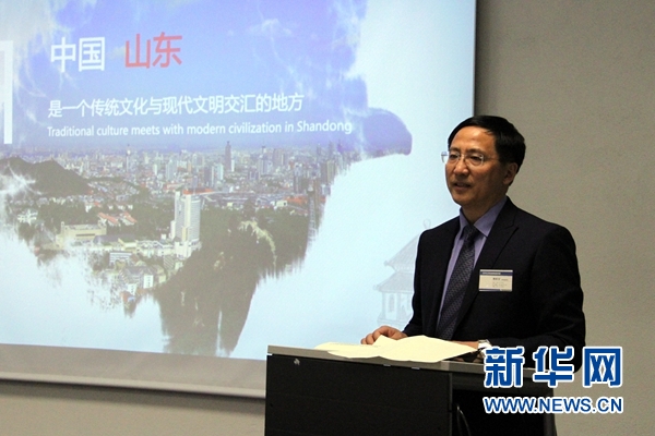 8月31日,挪威首都奥斯陆,山东省委组织部常务副部长惠新安在推介会上发言。新华网发
