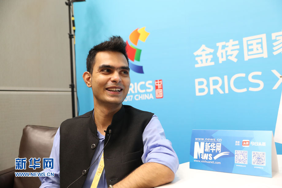 新华网在金砖国家领导人厦门会晤新闻中心的报道工作顺利进行。图为新华网记者正在对印度记者进行采访。 新华网 陈竞超 摄