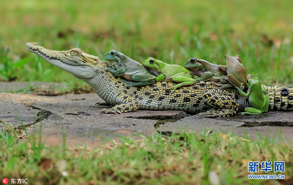 2016年11月5日报道(具体拍摄时间不详),印尼摄影师Tanto Yensen唐格朗旅游时拍到搞笑一幕,一群懒惰的青蛙准备在一条鳄鱼身上搭便车,它们排队上车秩序井然,远看就像在跳康茄舞,画面十分逗趣。(图片来源: 东方IC)
