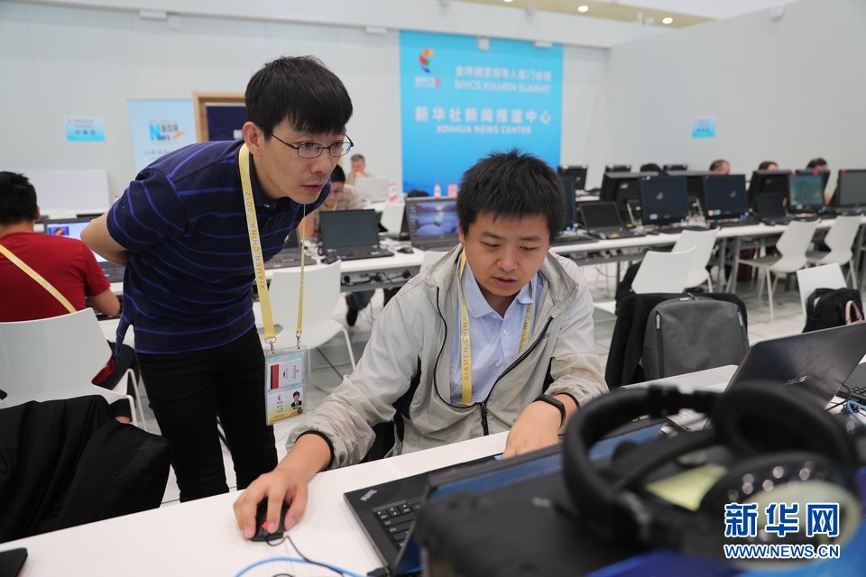 9月5日上午,金砖国家领导人第九次会晤在厦门国际会议中心举行新兴市场国家与发展中国家对话会。新华网对会议进行网络直播。图为新华网前方报道人员在设于厦门国际会展中心的新华社报道中心进行稿件编发工作。新华网 陈竞超 摄