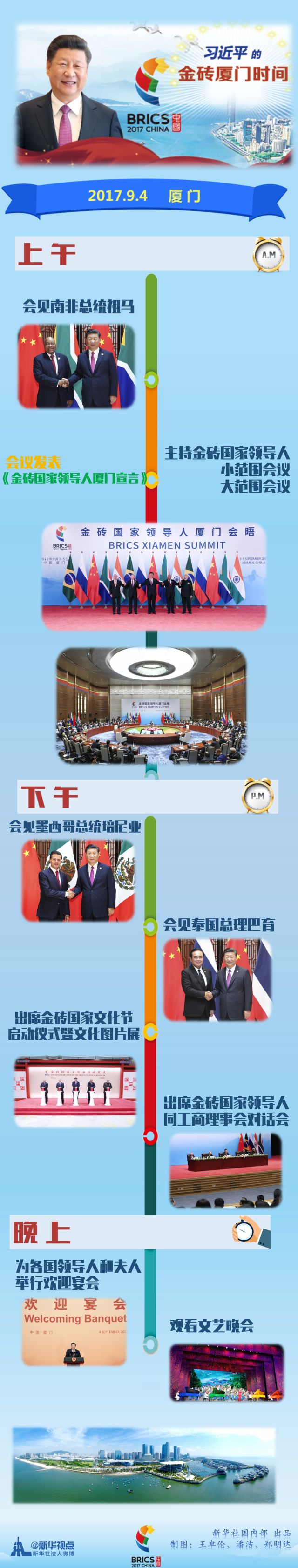 厦门,顾名思义是“大厦之门”。我衷心希望厦门会晤为我们开启新的合作之门、发展之门,迎来金砖合作第二个“金色十年”,开辟新兴市场国家和发展中国家光明未来。