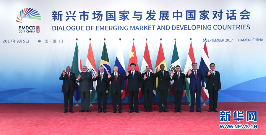 9月5日,国家主席习近平在厦门国际会议中心主持新兴市场国家与发展中国家对话会并发表重要讲话。金砖国家领导人巴西总统特梅尔、俄罗斯总统普京、印度总理莫迪、南非总统祖马和对话会受邀国领导人埃及总统塞西、几内亚总统孔戴、墨西哥总统培尼亚、塔吉克斯坦总统拉赫蒙、泰国总理巴育出席对话会。这是对话会前,习近平同出席对话会的各国领导人集体合影。