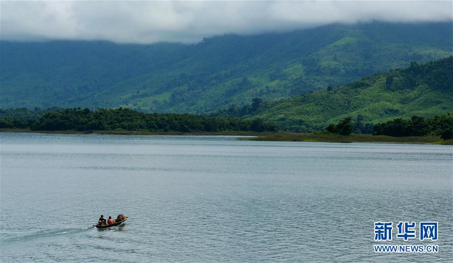 9月6日,在老挝万象省南俄湖,一条小船在湖面上划过。南俄湖位于南俄河下游,距离万象约80公里。湖中有数百座小岛,景色怡人。 新华社发(刘艾伦摄)