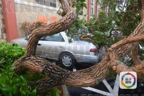 9月10日,在美国佛罗里达州迈阿密,一棵树被大风吹倒后压在汽车上。( 新华社记者殷博古摄)
