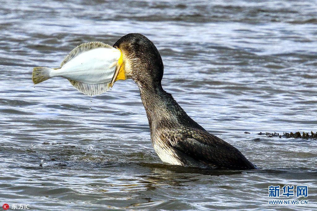 2017年9月12日报道(具体拍摄时间不详),鸬鹚也许是世界上最贪婪的海鸟了,尤其是Les Park在苏格兰纽堡市拍摄到的这一只。在Les的镜头中,这只鸬鹚试图吞下尺寸是自己头部3倍大的比目鱼,有一刻,鸬鹚甚至快要把自己的喙给崩裂了,但仍然没能把鱼吞下肚。最后,鸬鹚尝试了不同的角度,为的就是把鱼整个吃进肚里。摄影师Les说,鸬鹚这种海鸟,总想要一口把猎物整个吞进肚里。(图片来源:东方IC)