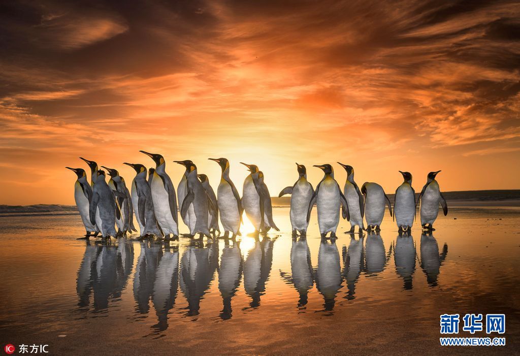 2017年9月12日报道(具体拍摄时间不详),这群可爱的帝企鹅来自南美洲福克兰群岛,一大早,它们摇摇晃晃地出街,在跳水晨游前悠闲地散个步。45岁的野生动物摄影师Wim van den Heever来到福克兰群岛旅游,并想探索一些新景点,为以后的行程做攻略。就在这时,他幸运地遇到了这群小家伙,Wim说,日出的光辉折射在海面上,为整个画面加了分。(图片来源: 东方IC)