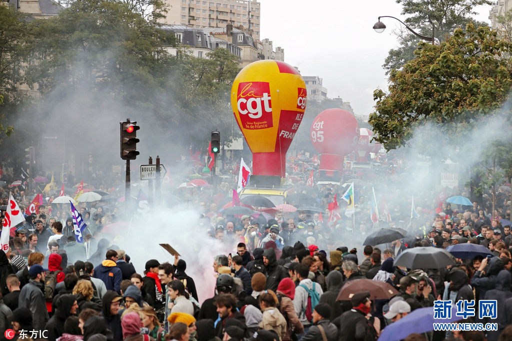 当地时间2017年9月12日,法国巴黎,民众罢工游行。法国工会组织“劳工总工会”(CGT)号召民众9月12日走上街头,抗议现政府强行通过劳动法改革方案。(图片来源: 东方IC)
