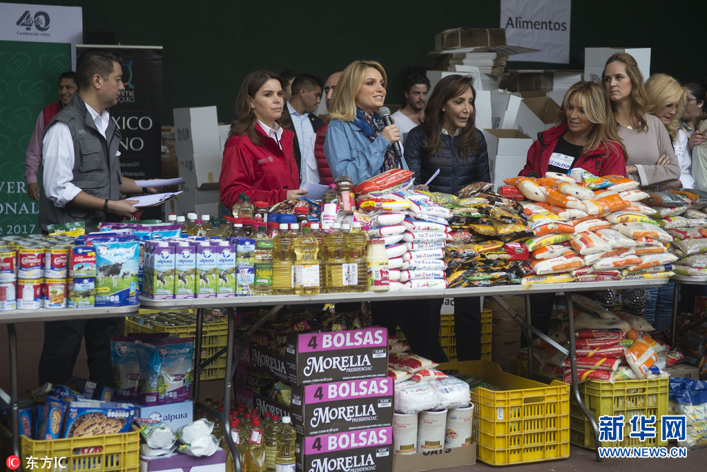 当地时间2017年9月11日,墨西哥墨西哥城,墨西哥总统夫人安赫丽卡·里维拉就赈灾物资举行新闻发布会,第一夫人还现场搬起救灾物资。(图片来源: 东方IC)