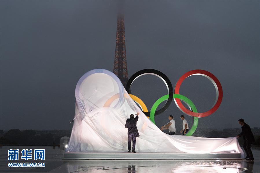 9月13日,工作人员在法国特罗卡德罗广场为奥运五环标志揭幕。