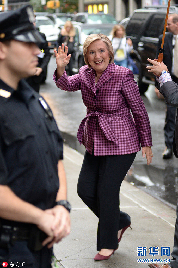 当地时间2017年9月19日,美国纽约,希拉里·克林顿参加斯蒂芬·科尔伯特晚间秀(The Late Show With Stephen Colbert)。紫色格纹上衣加腰带,让希拉里身材略显臃肿。图片来源:东方IC