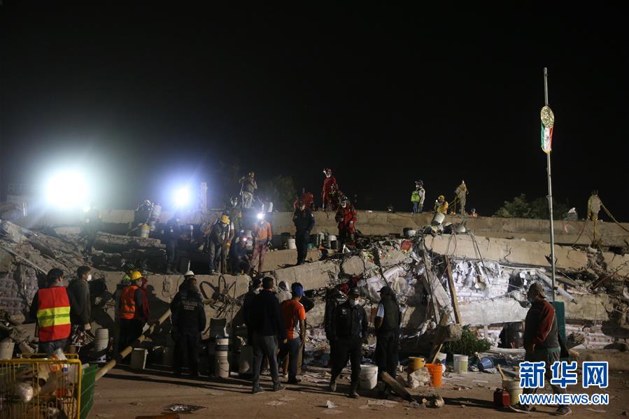 9月20日,在墨西哥城玻利瓦尔街,救援人员在一处倒塌的写字楼搜救。