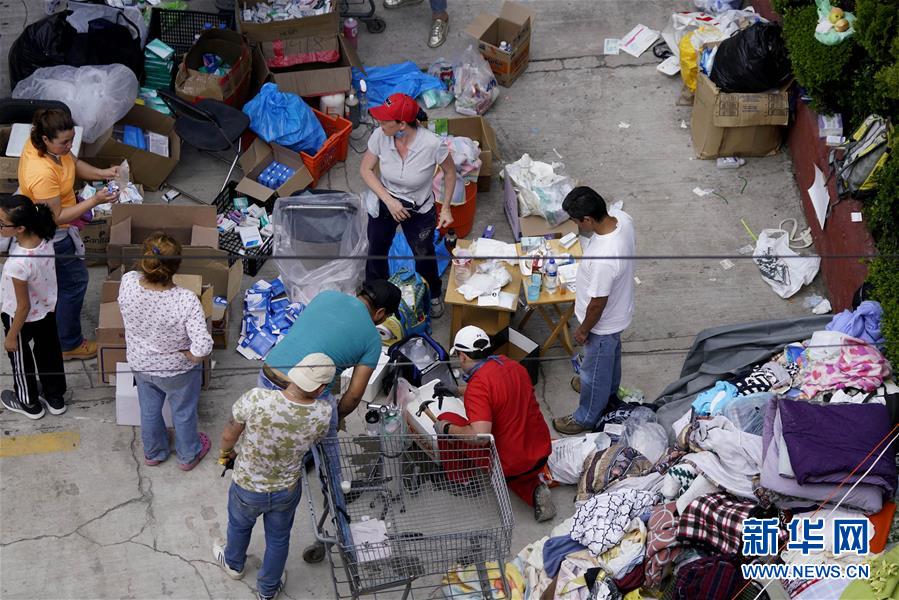 9月20日,在墨西哥首都墨西哥城,志愿者整理人们捐赠的物品。