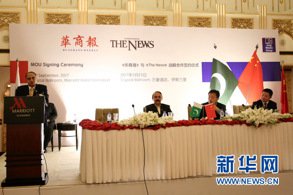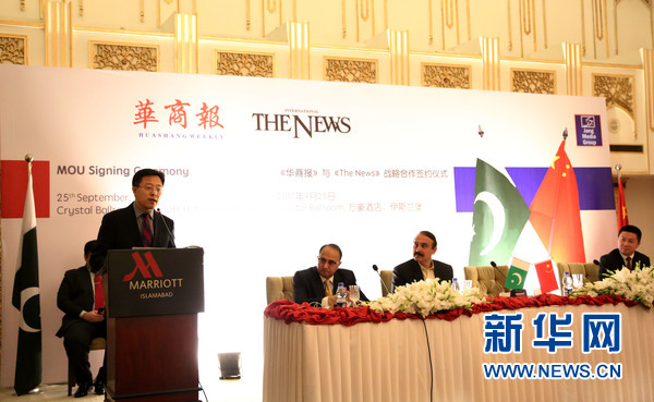 9月25日,在巴基斯坦首都伊斯兰堡,巴基斯坦《新闻报》总经理萨尔马德·阿里在该报与《华商报》签署合作协议仪式上致辞。当天,巴基斯坦国内唯一发行的华文报纸《华商报》与巴发行量最大的英文报纸《新闻报》在伊斯兰堡签署合作协议,双方将合作在《新闻报》上开设中文专版,刊登中国新闻。新华网发(艾哈迈德•卡迈勒摄)