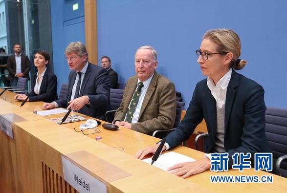 9月25日,在德国首都柏林,德国选择党主席彼得里、联邦发言人莫伊滕、大选候选人高兰和魏德尔(从左至右)出席新闻发布会。德国24日举行新一届联邦议院选举。25日凌晨出炉的初步计票结果显示,右翼民粹主义政党德国选择党获得12.6%的选票,将首次进入联邦议院并成为第三大党。这是二战后德国首次有右翼民粹主义政党进入联邦议院。新华社记者单宇琦摄