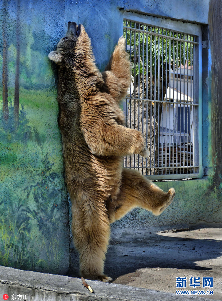 当地时间2014年7月1日报道(具体拍摄时间不详),俄罗斯Rostov-on-Dov动物园内,只见一只熊慢慢地走到一堵墙旁边,站了起来,靠着墙壁上下左右摩擦挠痒,动作看上去就像是《森林王子》里的莫格利的老朋友大熊巴洛(Baloo)在跳舞,非常滑稽。图片来源:东方IC